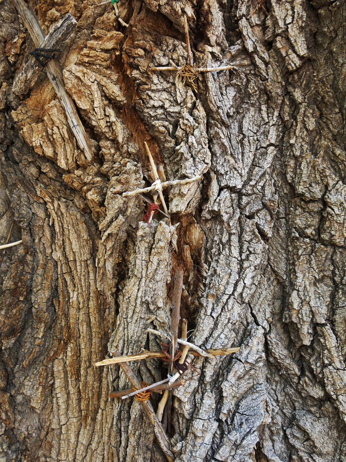 After enough years, the crosses placed on this tree have become embedded in the bark